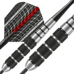 The Black Jack range is a sleek and menacing series for the advancing player. The “Tungsten Look” barrels feature precision black knurling, for maximum grip and optimum control. The barrels are teamed with the very latest advances in shaft and flight technology.
