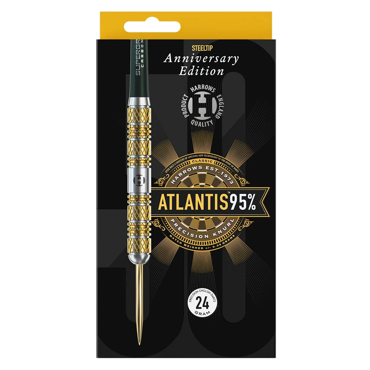 Harrows Atlantis 24g 95% Tungsten Steeltip 50th Anniversary Darts marked another notable milestone in Harrows history, as they were the first 95% tungsten darts ever released by Harrows. The higher tungsten percentage meant that Harrows were able to manufacture a slim barrel, popular with players due to the increased scoring capacity. These darts feature a heavy knurl pattern in segments over the length of the parallel barrel to provide a consistent, firm grip.