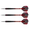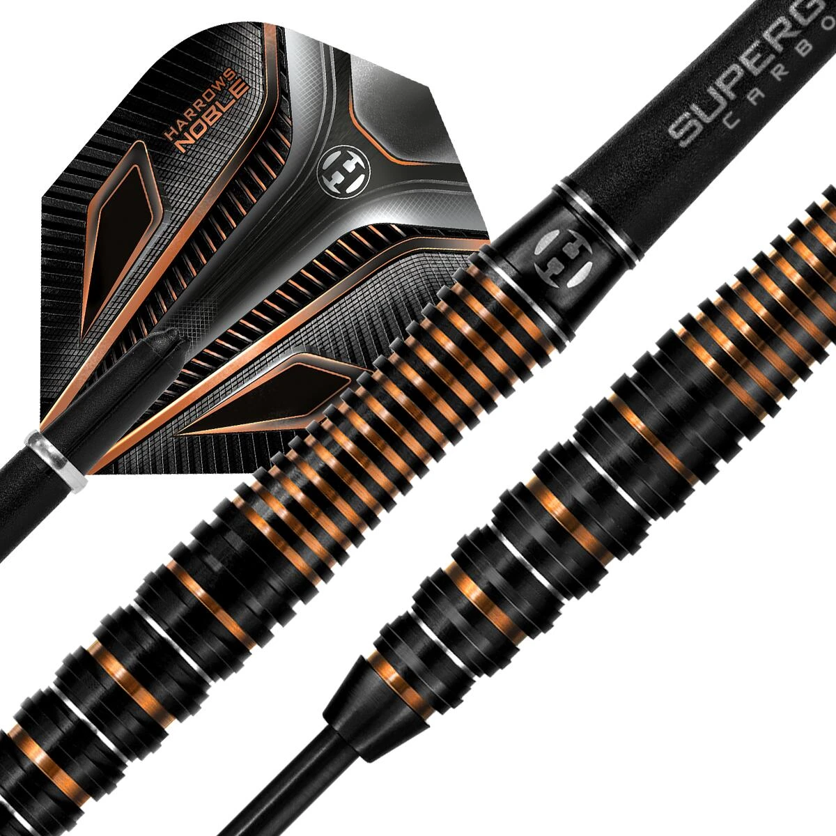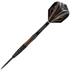 High quality injection moulded 90% tungsten. Unique barrel shape. Supergrip Carbon shafts. 100 micron flights. Black PVD and metallic gold coating.