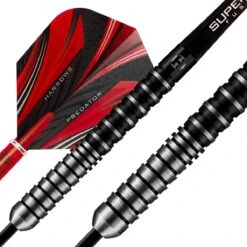 Predator darts have been created with 3 prominent grip zones which cover the length of the barrel to appeal to front, middle and rear grippers. The tapered barrels have been designed to ensure consistent finger positioning with an intense feel. The dart is coated in black titanium nitride and precisely re-machined to produce a sleek and stylish dart. The darts are match weighed to +/- 0.05 grams and fitted with Black/Red Midi Supergrip Fusion shafts and new Predator flights.