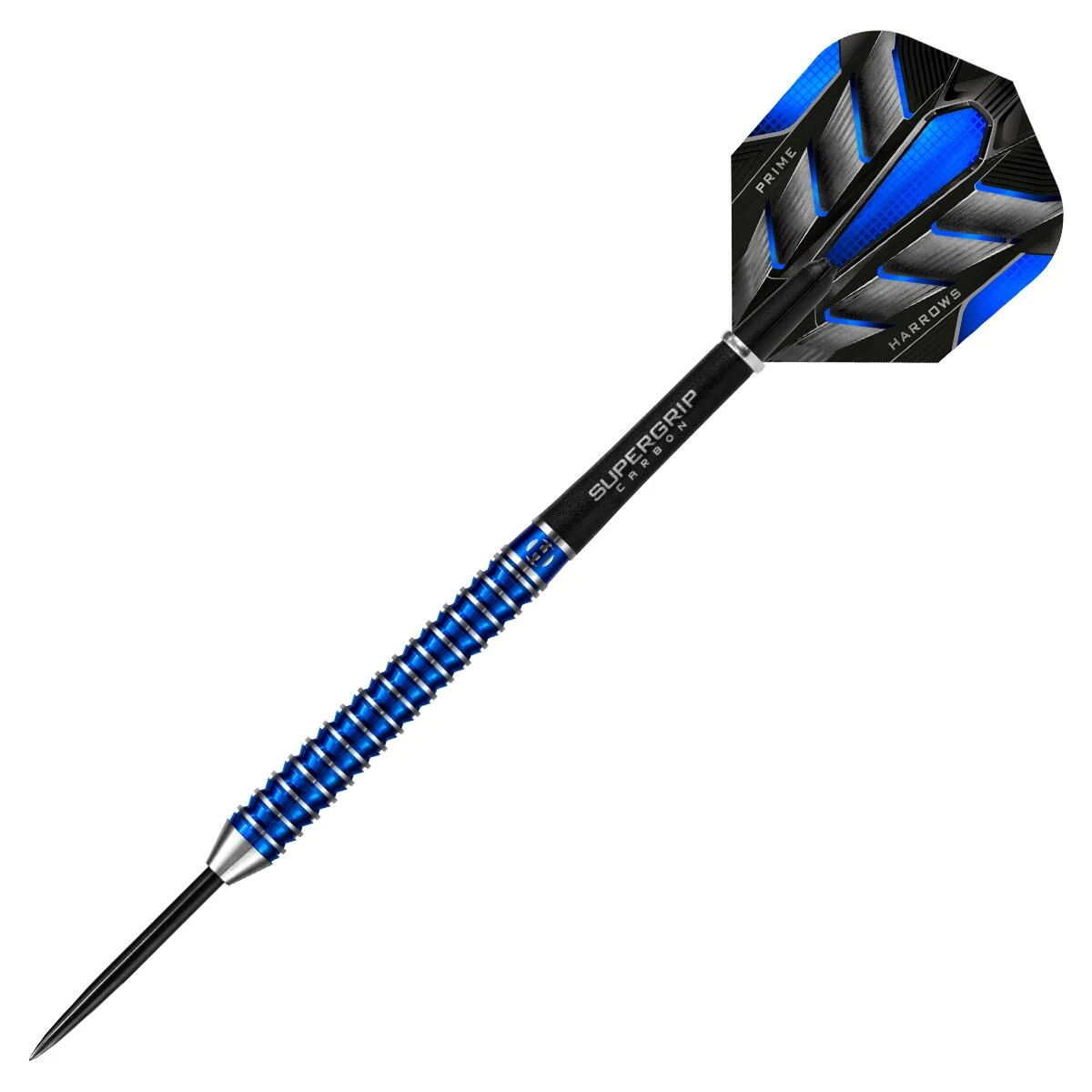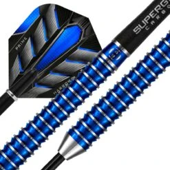 A tapered barrel with a mix of precise ringed and reverse cuts to give a unique feel. High quality 90% tungsten. Supergrip Carbon shafts. 100 micron flights. Blue metallic coating.