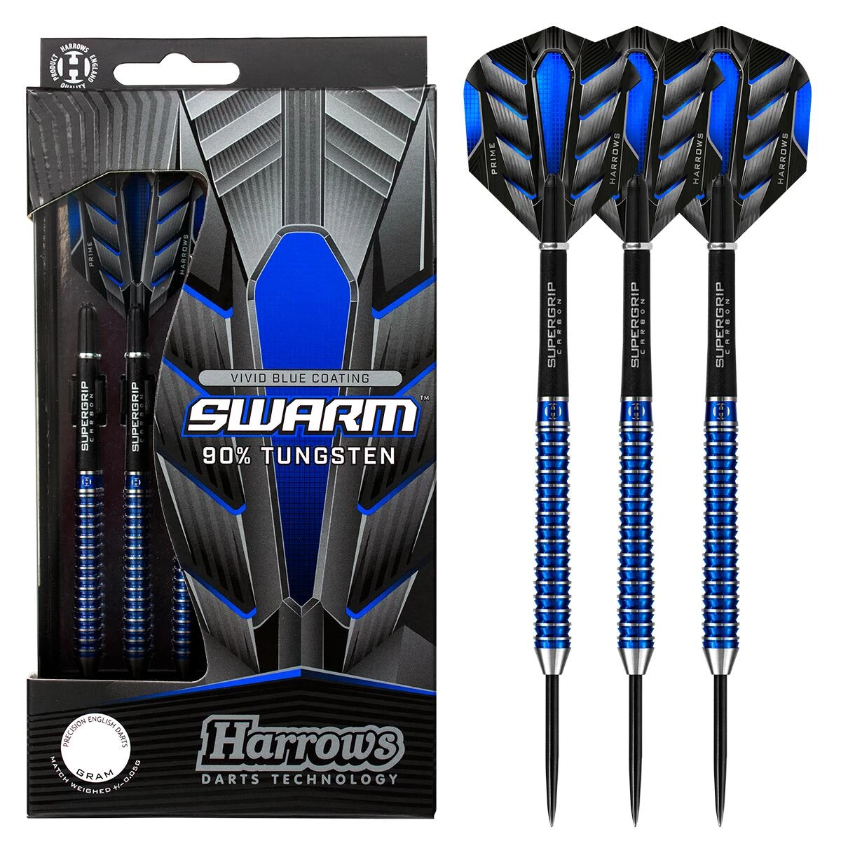 Swarm darts are supplied with Blue Supergrip Fusion shafts and new Prime flights. Match weighed to +/- 0.05g.
