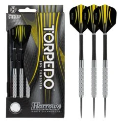 The Harrows Torpedo range has been upgraded to 80% tungsten. The Harrows Torpedo darts feature parallel barrels, nylon shafts with flight retaining ring grips and are teamed with Marathon flights.