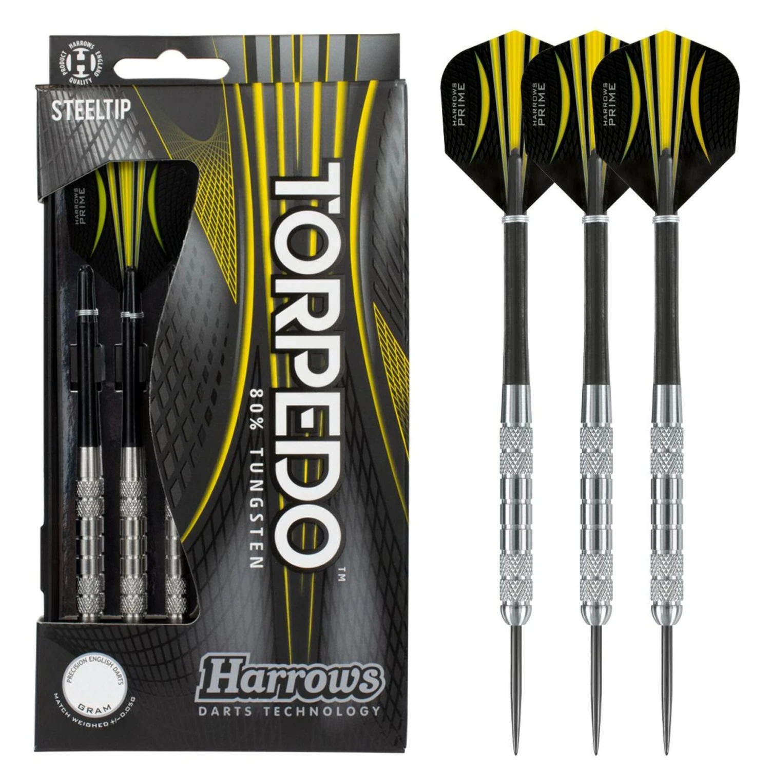 The Harrows Torpedo range has been upgraded to 80% tungsten. The Harrows Torpedo darts feature parallel barrels, nylon shafts with flight retaining ring grips and are teamed with Marathon flights.