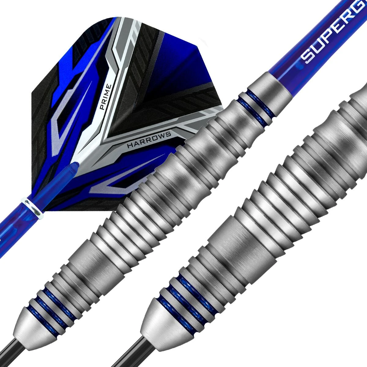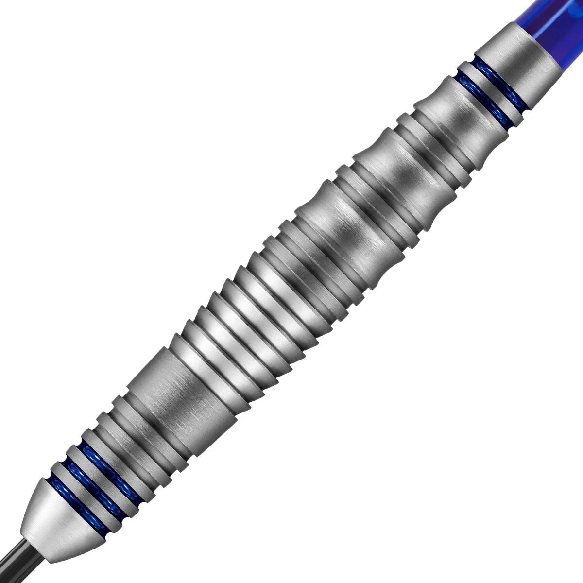 A tapered brass dart with a mix of shark, scalloped and ringed cuts. Premium brass dart. Supergrip shafts. 100 micron Prime flights. Tough matte silver coating with blue rings.