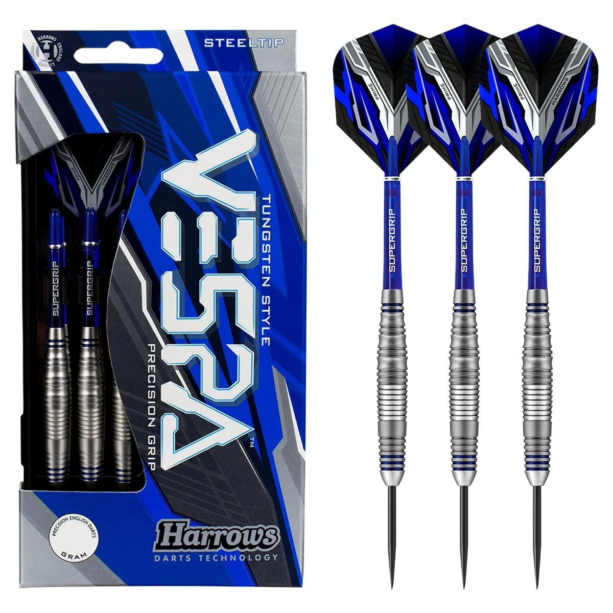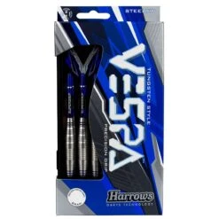 Vespa is the latest addition to Harrows dynamic brass range. Shark, ringed and scalloped grips, along the length of the bulbous barrel, combine to give Vespa a truly unique feel.Once the barrel has been cut, it is coated in a tough matte silver to complete the tungsten look. Lastly, 5 electric blue rings are added to really make the dart stand out.